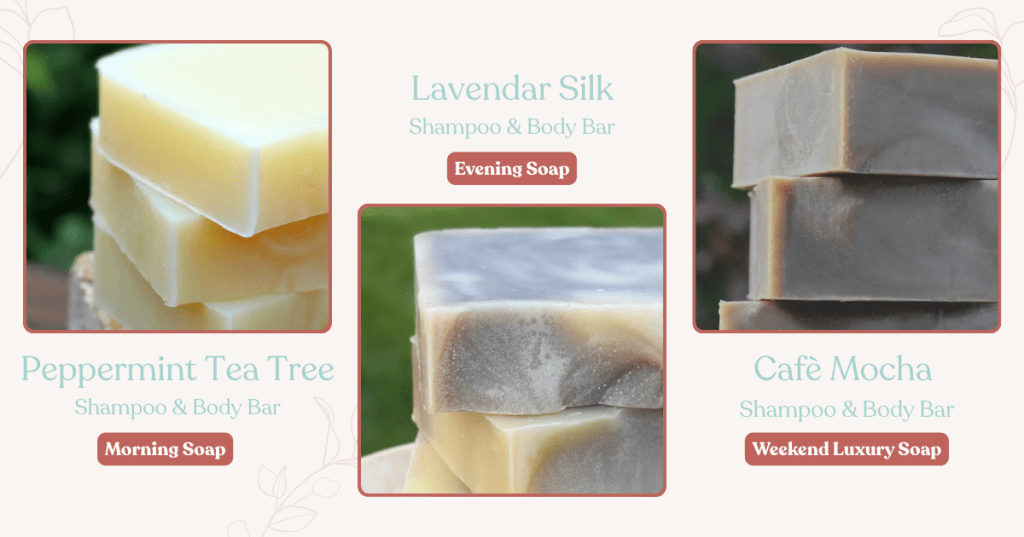 Evening soap – Lavender, chamomile, maybe vanilla. The olfactory equivalent of permission to stop working. Try the Lavender Silk bar or Lavender Chamomile.