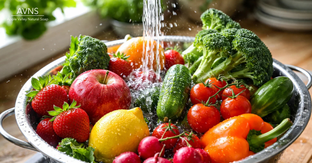 Produce picks up pesticide residue, wax coatings, and handling grime throughout the supply chain. A diluted castile wash rinses it all away without affecting the taste or safety of your food.