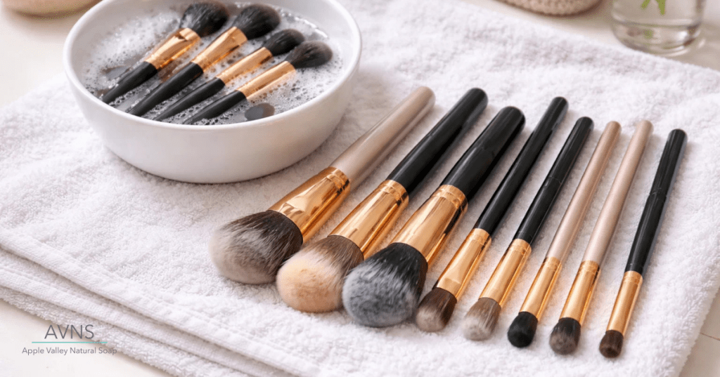 Mix: 1 cup warm water + 1 teaspoon castile soap. Swirl brushes gently, rinse, lay flat to dry.